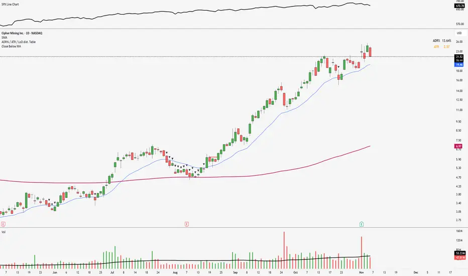 When a candle closes below the selected MA, a small black arrow appears above the bar, and an alert can be triggered for instant notifications.