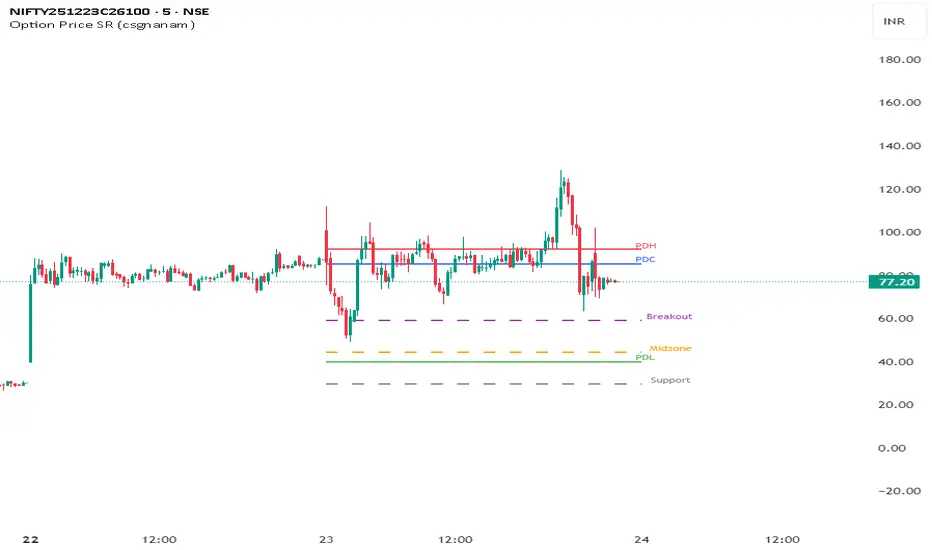 The indicator helps traders classify the market into **range-bound, breakout, or invalid trade zones** by observing how **ATM Call (CE) and Put (PE)** prices react around these levels.