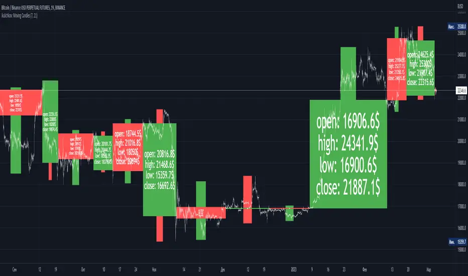 Moving Candles is an indicator developed by TradingView user ikulichkov, designed to provide a new perspective on price action. The Moving Candles indicator works by creating unique candlesticks that incorporate both box and line elements. The box element is used to represent the price range of each candle, while the line element represents the opening and closing prices. This provides traders with a visual representation of the relationship between the opening and closing prices and the overall trend of the market.
