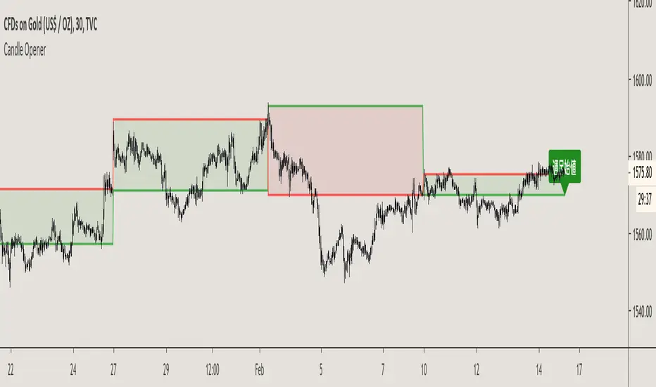 Illustrates open and close of the superior candles; the timeframe is choosable from pulldown menu.