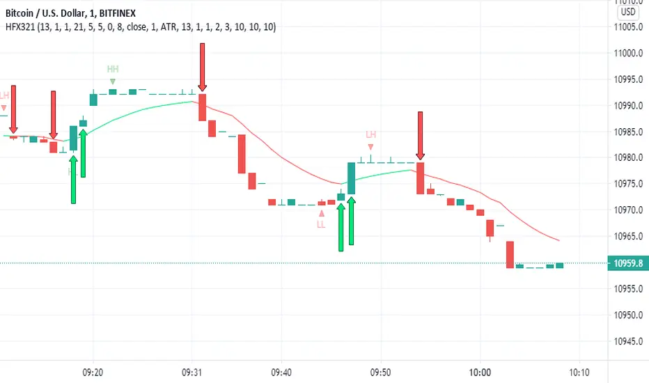 It will show an alert Arrow (green) pointing UP for the First Candle after a pivot LOW (LL, HL) that could indicate a trend reversal.