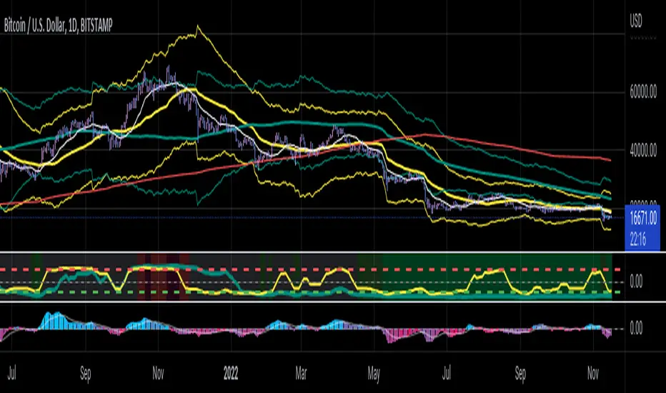 The two values in yellow and teal relate to the price action and where they fall in the Fibonacci Bands for the 50 and 200 VWMAs, respectively. These values are scaled logarithmically, making it so that the 7 period moving averages of the values tend to 'stick' to the top (just above 20) or bottom (just below -20). When the background color is deep red, this indicates that there is bullish momentum and likely a bull market. The inverse, in green, represents bearish momentum or a bear market. These colors correspond to the 200 period VFIB.