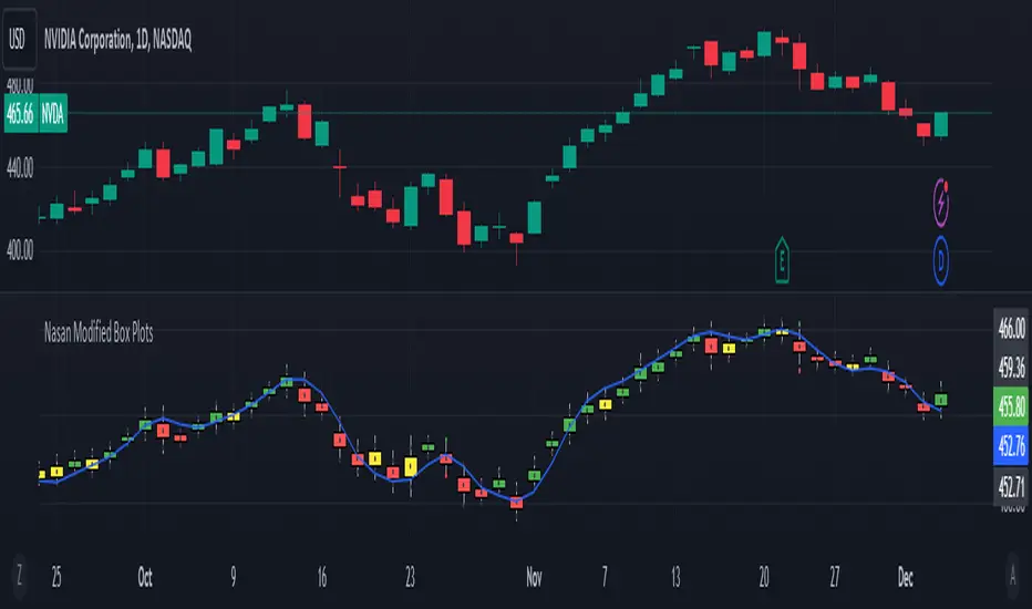 The "Nasan Modified Box Plots" indicator on TradingView is a dynamic visualization tool that provides insights into the distribution of price ranges over a specified period. It adapts to changing market conditions by incorporating historical data in the calculation of a scaling factor (d). The indicator constructs a modified box plot, where the size of the box and the whiskers is determined by recent volatility