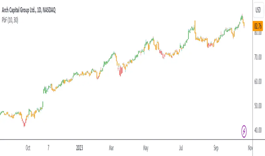 The PbF script employs simple moving averages (SMA) as its backbone. Bars positioned above both the SMAs turn green, indicating a bullish trend. Conversely, bars below these SMAs turn red, signalling a bearish trend. When a bar oscillates between the SMAs, it turns orange, hinting at a potential pullback scenario.