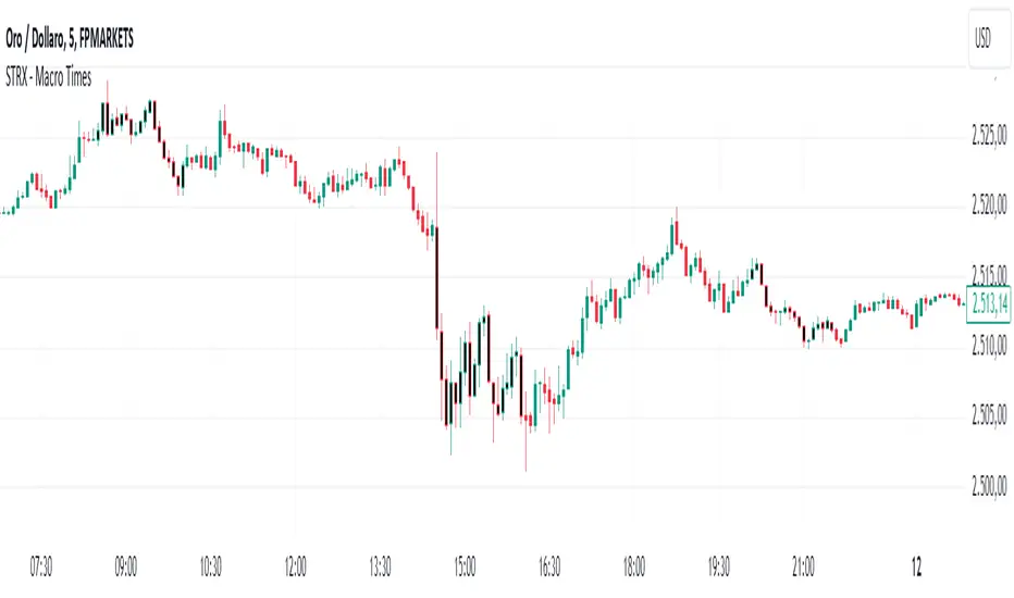 The STRX - Macro Times is an advanced indicator designed to highlight key moments in financial markets based on specific macroeconomic time frames for Forex, Indices, and Gold. With this tool, you can optimize your trading decisions by monitoring periods of increased volatility and activity in the markets, leveraging the most strategic time windows to operate.