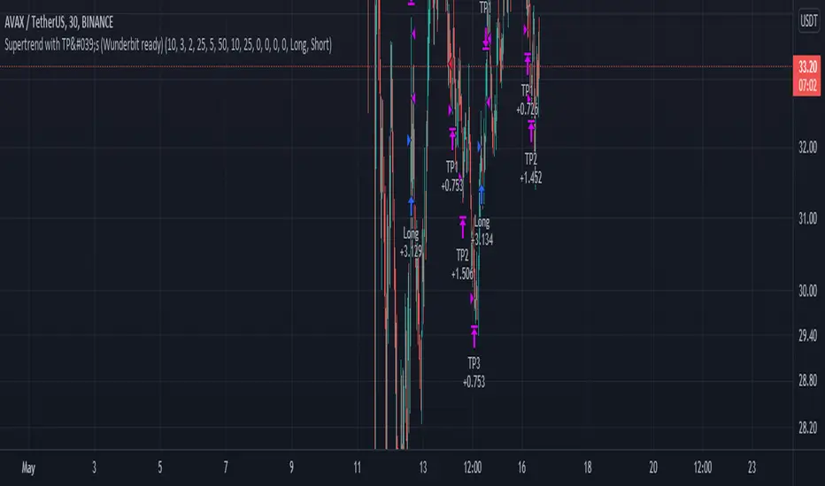 Opens a position with Supertrends strategy then adds Take Profit points with certain amounts of current position.