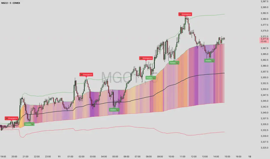 - RSI-Based Heat Map: Offers intuitive heat map coloring between standard deviation bands, colored dynamically according to RSI levels and divergence activity.