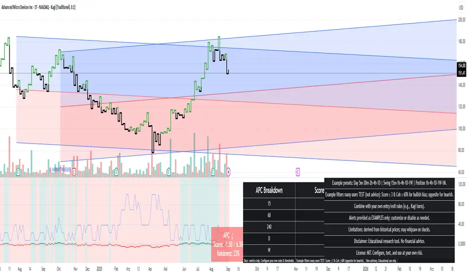 APC is a research/education tool that condenses trend information from five timeframes into a single compass. It shows Direction (↑/↓/→), a weighted Score, and Coherence (how strongly timeframes agree). The script is non-repainting (security(..., lookahead=off)) and includes a readable breakdown panel and example alerts.