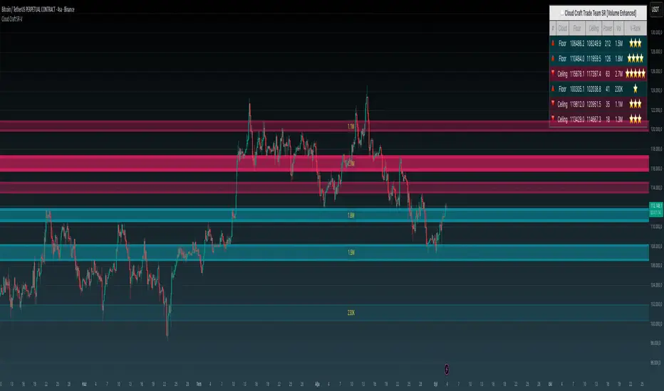 Cloud Craft SR [Volume Enhanced] is an advanced support and resistance detection system that combines price action analysis with volume dynamics to identify high-probability trading zones.