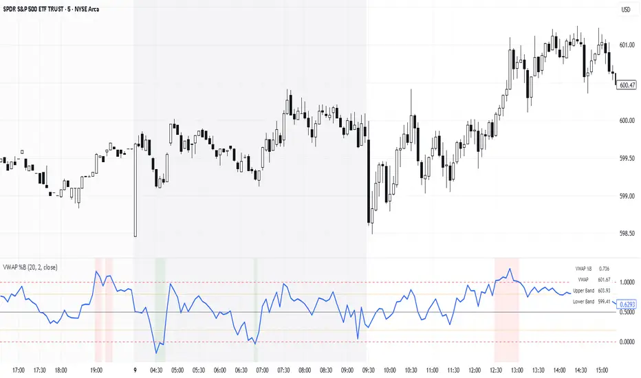 The VWAP %B indicator combines the reliability of VWAP (Volume Weighted Average Price) with the analytical power of %B oscillators, similar to Bollinger Bands %B but using volume-weighted statistics.