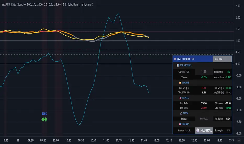 The **Institutional PCR Analytics Suite** is a comprehensive options flow analysis tool that goes beyond basic Put-Call Ratio calculations. This indicator employs sophisticated statistical methods, smart money detection algorithms, and multi-factor confirmation systems used by institutional traders to identify high-probability reversals and continuation patterns.