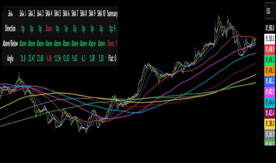 This script, "Multi-SMA Dashboard (10 SMAs)," creates a dashboard on a TradingView chart to analyze ten Simple Moving Averages (SMAs) of varying lengths. It overlays the chart and displays a table with each SMA’s direction, price position relative to the SMA, and angle of movement, providing a comprehensive trend overview.