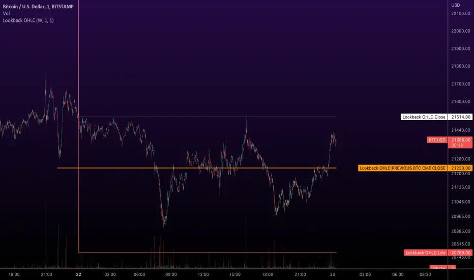 This indicator displays x number of unit's of time's open, high, low, close. Default view is a weekly segment 1 unit back. There are many strategies you can deploy using this indicator. One of them is to look at how price acts around the "mid" line. It can get sticky around that area. If price rejects or passes through, there is a good chance of test of the "low" level.