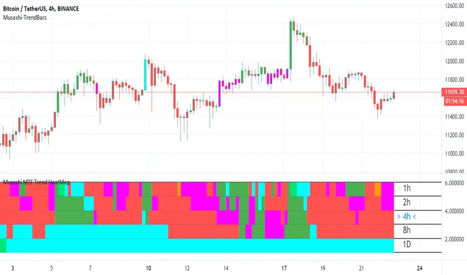 This HeatMap, shows 5 different time zones, each with color codes to indicate the trend expression of a corresponding timeframe.