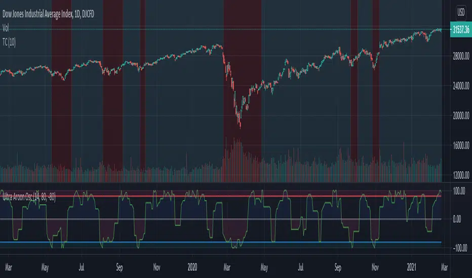 The Aroon Oscillator moves between -100 and 100. A high oscillator value is an indication of an uptrend while a low oscillator value is an indication of a downtrend.