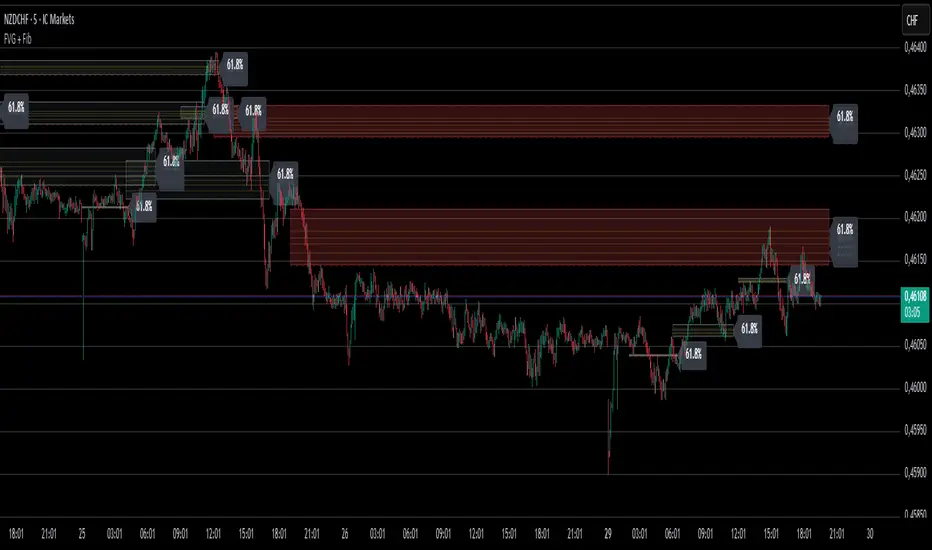 The indicator includes comprehensive customization options, allowing users to control the appearance of FVG zones, Fibonacci levels, and extension lines with different colors and styles. It features intelligent zone management with configurable maximum counts and extension lengths, automatic validity checking that grays out filled gaps, and multiple alert conditions for when price enters FVG zones or touches Fibonacci levels. The tool is designed for both swing and intraday traders who want to combine the powerful concepts of Fair Value Gaps with precise Fibonacci-based entry and exit strategies.
