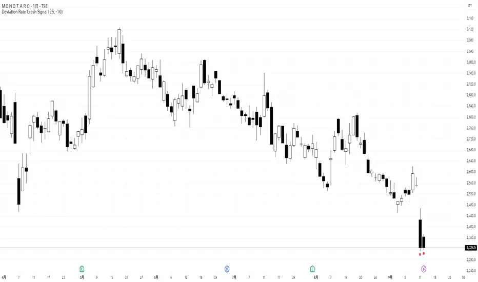 A signal is triggered when the deviation rate from the 25-day moving average falls below -25% (default setting). On the chart, a red circle is displayed below the candlestick to indicate the signal.