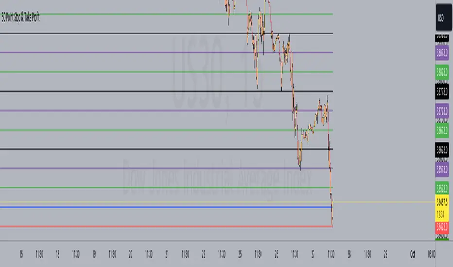 This custom TradingView indicator is designed for instruments like US30 or any asset following a point system. It assists traders in setting precise stop-loss and take-profit levels based on different risk-reward ratios. It calculates and plots horizontal lines at various price levels above and below your specified entry price, with a 50-point difference between each ratio.
