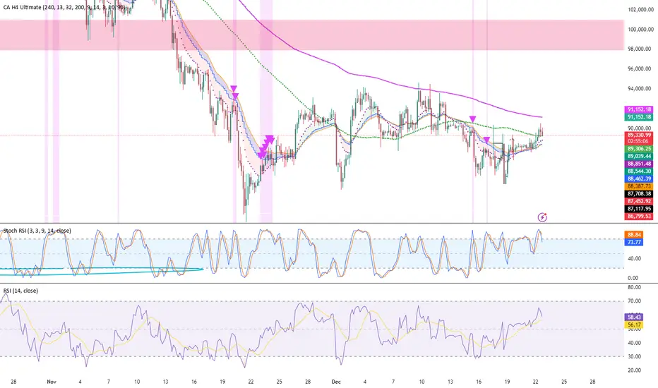 Here is a trend-following strategy I coded for the H4: it first filters the overall direction via the EMA 200, waits for a precise price correction in the recharge zone (between EMA 13 and 32), and only validates the entry if the Stoch RSI confirms an extreme extension (< 10 or > 90) to maximize the chances of a rebound. With a comprehensive tool designed for Trend Following and Pullback traders. It combines Short-Term Momentum, Long-Term Structure, and Multi-Timeframe (MTF) analysis into a single, clean indicator.