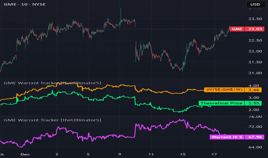 The GME Warrant Tracker was designed to be used for GME warrants tracking. The theory behind this indicator is that warrants are priced similarly to options and generally follow the same Greeks. With that assumption, we can break down the price of the warrants by using known Greeks to estimate either the theoretical price, or even estimate Implied Volatility (IV).