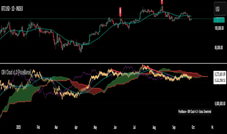 # OBV Cloud v1.0.1 [PriceBlance] — Free & Open-Source*Ichimoku-style Cloud applied to OBV for money-flow regimes, cleaner filters (EMA9/WMA45), ADX-on-OBV strength, and OBV↔Price divergence.*