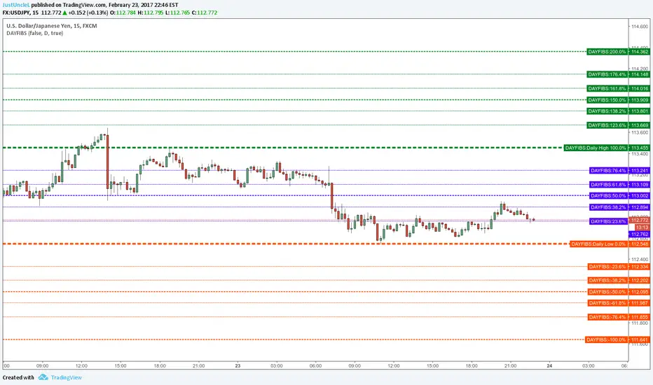 This is another indicator in my Pivot level series. This one automatically draw Fibonacci levels based on the previous day's lowest (0%) and highest (100%) values, similar to a Fibonacci retracement.