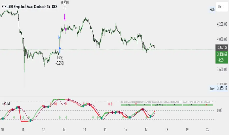 “AlgoWay GRSIM” is a reversal-with-confirmation strategy: it spots likely turns, demands real momentum alignment (optionally verified by impulse direction), and manages exits with clear momentum cues plus built-in protective limits.
