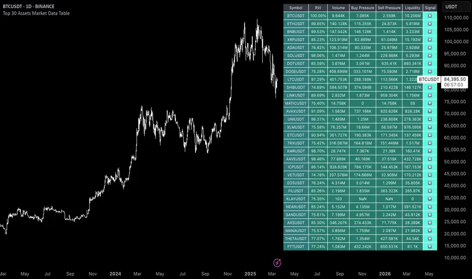 This update moves the script from version 5 to version 6. The table now displays market data for 30 assets instead of 6 coins. Instead of separate inputs for each asset, an array is used to store all asset symbols, and header names and colors are managed via arrays. The updated script includes individual alert conditions for each asset based on the Relative Volatility Index (RVI) and calculated buy/sell pressure values. In addition, the code has been restructured for improved readability and scalability, with more detailed table population logic and refined color settings for different columns.Скрипт с защищённым кодом