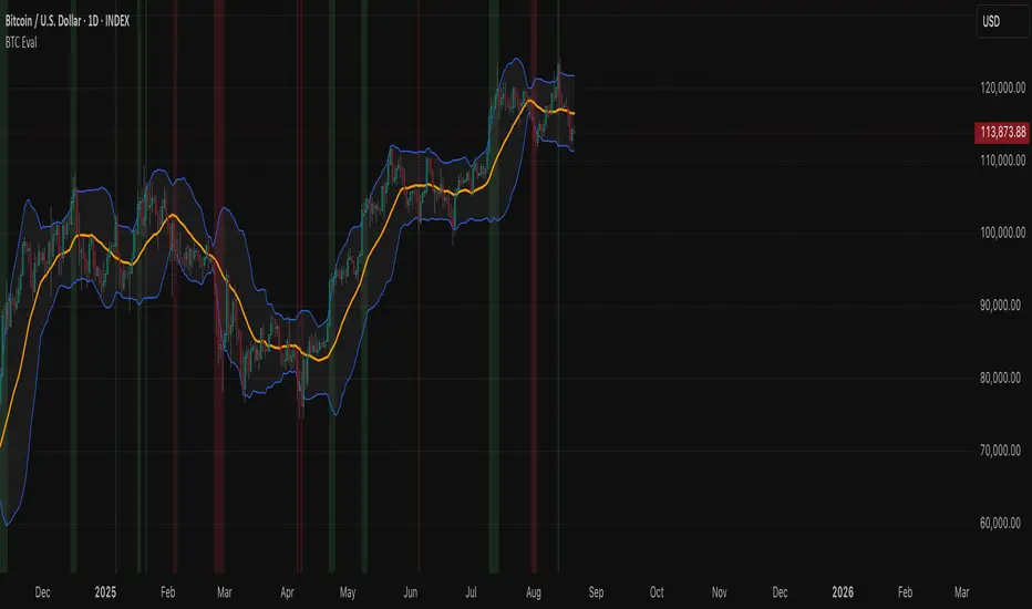The BTC Evaluation Indicator is a volatility-based tool designed to help traders evaluate Bitcoin’s price behavior relative to its moving average trend. It combines customizable moving averages with dynamic standard deviation bands to identify overbought and oversold conditions.