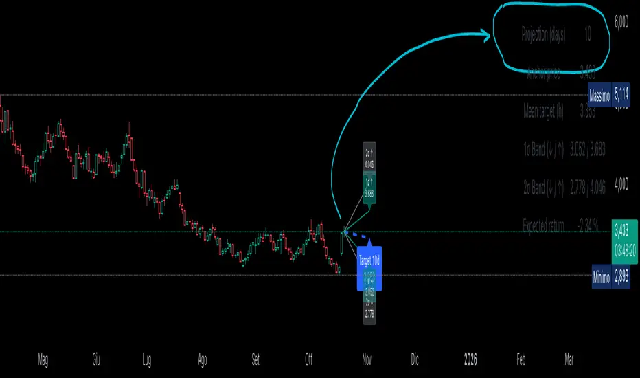 “Statistical Projection over N Days (drift + σ)” is a quantitative forecasting model that estimates the expected future price range of any asset over a chosen horizon (default = 10 days).