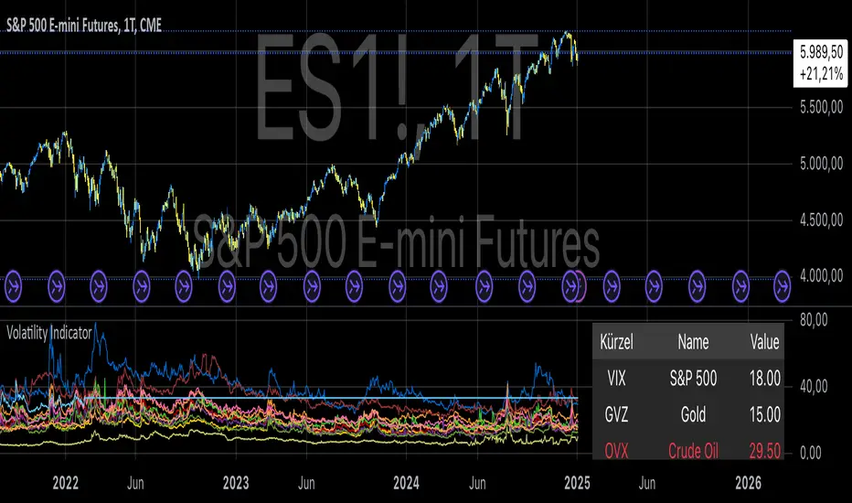 Volatility, defined as the magnitude of price changes, is often regarded as a measure of market uncertainty or risk. Financial markets exhibit periods of heightened volatility that may precede significant price movements, whether upward or downward (Christoffersen, 1998). The indicator presented in this script tracks several key volatility indices, including the VIX (S&P 500), GVZ (Gold), OVX (Crude Oil), and others, to help identify periods of increased uncertainty that could signal potential market turning points.