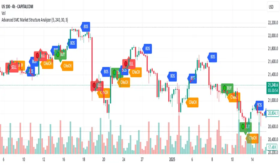 A multi-timeframe Smart Money Concepts (SMC) toolkit for detecting Breaks of Structure (BOS), Changes of Character (CHoCH), liquidity zones, order blocks, fair-value gaps, and raw entry signals—all in one overlay indicator.