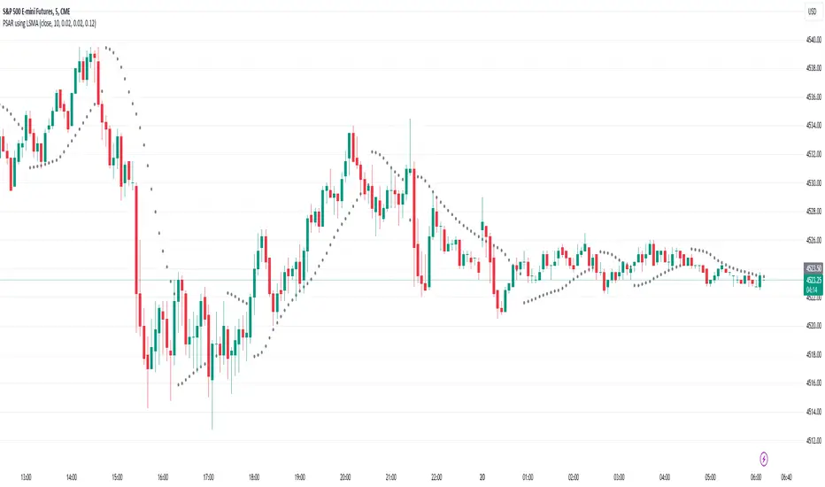 Works exactly as the standard PSAR with the only difference that a Moving Linear Regression Line (=Least Squares Moving Average, LSMA) is used as input.