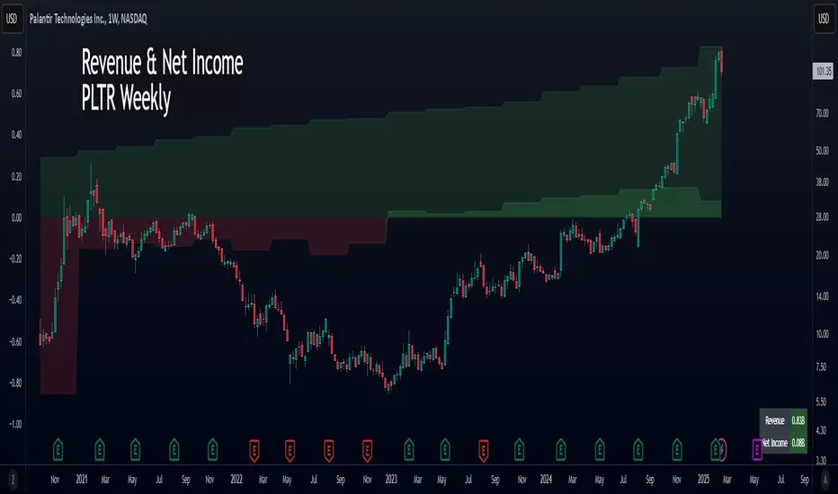 This indicator provides a clear visual representation of a company's revenue and net income, with the flexibility to switch between Trailing Twelve Months (TTM) and Quarterly data. Values are automatically converted into billions and displayed in both an area chart and a dynamic table.