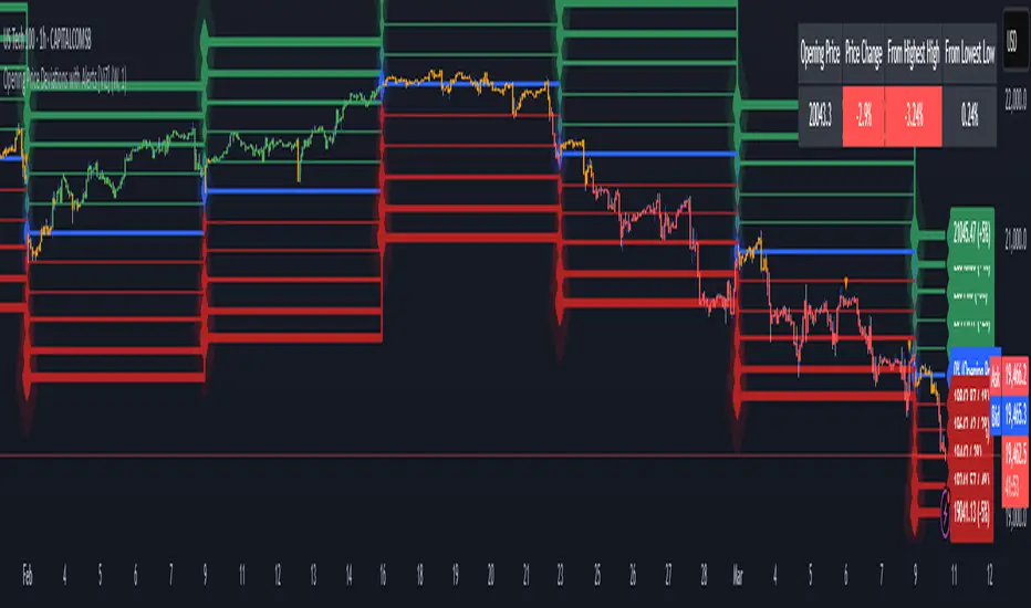 The Timeframe Opening Price Deviations indicator helps traders visualize how price deviates from a key reference point—the opening price of a selected timeframe (Daily, Weekly, or Monthly). It calculates upper and lower deviation levels based on a percentage step and plots these levels on the chart. This can help traders identify potential areas of support and resistance.