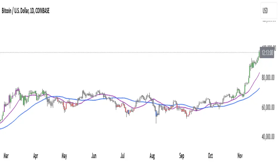 Trend and Momentum Insight: The color of each candle gives an immediate visual representation of both the trend (via MA crossovers) and momentum (via RSI). Green and red candles align with bullish or bearish trends, respectively, providing a quick reference for market direction.