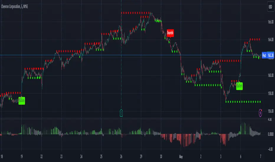 Dual Exponential Moving Averages (EMAs): Effectively detects trend directions and strength by using two EMAs—14 periods for the current time frame and 28 periods for a higher time frame defined by the user.