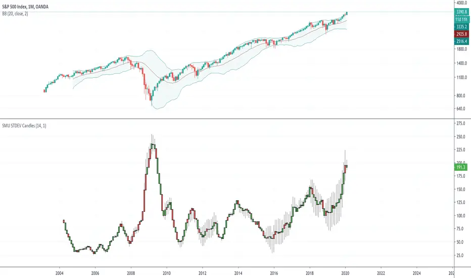 Is very similar to SMU RSI and SMU ROC. The interesting part is to see the full effect of traditional indicators in a candle format rather than a simple plot format. Very interesting view in SPX. There is a very big clue in the chart as STDEV changed since 2008. Can you figure it out?