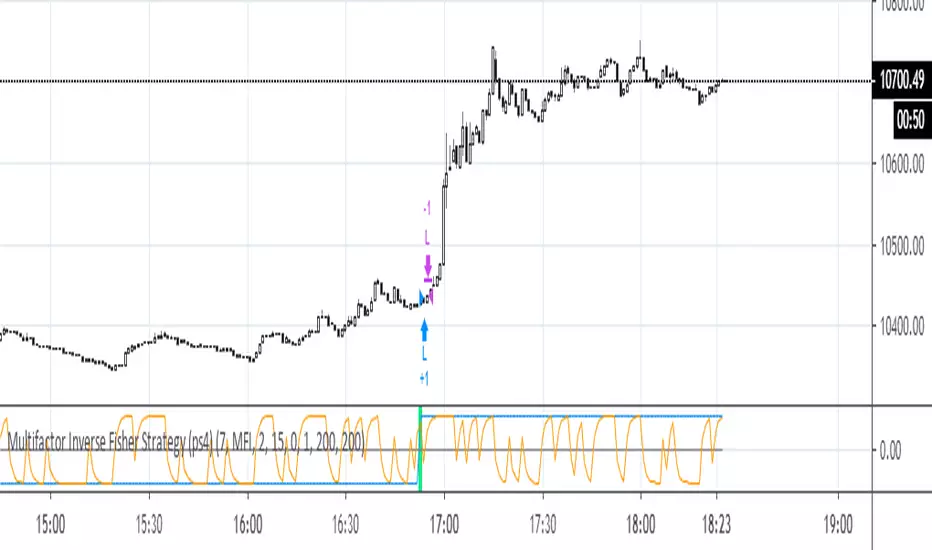 Best for higher time frames - 30m, 1H, 2H, 3H, 4H, D this strategy uses several factors that are pushed through an Inverse Fisher Transform (IFT). The higher the TF, the better the performance, up to 98%, but the number of deals tends to drop). Middle time frames (5m, 15m) look viable with Scaled Price (Scaled %P) and MFI factors. The factor list can be extended to include cci, stoch, rsi_stoch, emo, macd, cog, dpo, roc, accdist, cctbb, mom, awesome, tva, etc. Some of them need to be rescaled to a 0..100 interval. The IFT produces a value in the -1..1 interval (see: mesasoftware.com/papers/TheInverseFisherTransform.pdf). This indicator does NOT repaint.