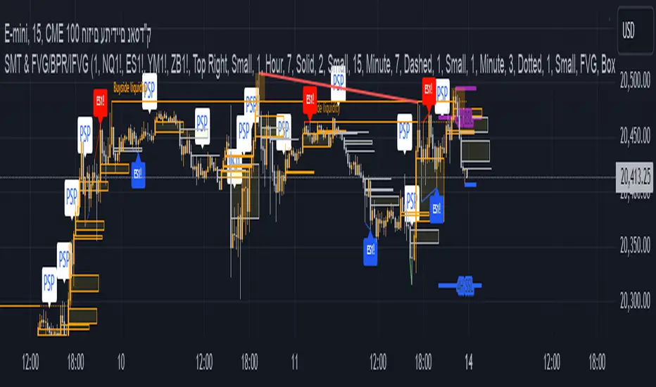 PSP FVG Signals: Purple arrows indicate FVGs detected within PSP ranges on the 1-minute timeframe.