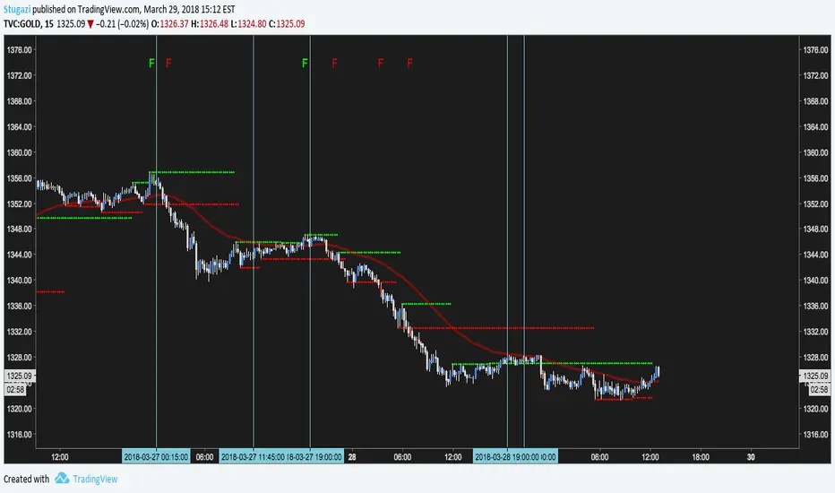 The vertical lines are when the alerts fired in TradingView. Along the top a green F is LONG signal and red F is SHORT. Signals fire only after CLOSING for two consecutive bars above or below a fractal. Also there is a min delay of 12 bars between signals.