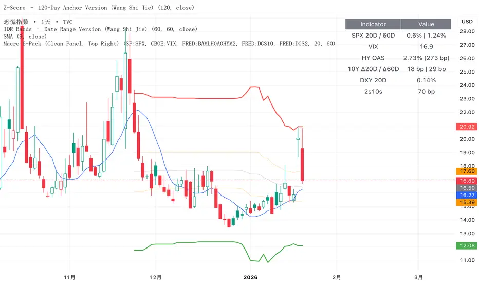 Macro 6-Pack dashboard: SPX momentum, VIX, HY credit spread, 10Y yield shifts, DXY trend, and 2s10s curve.