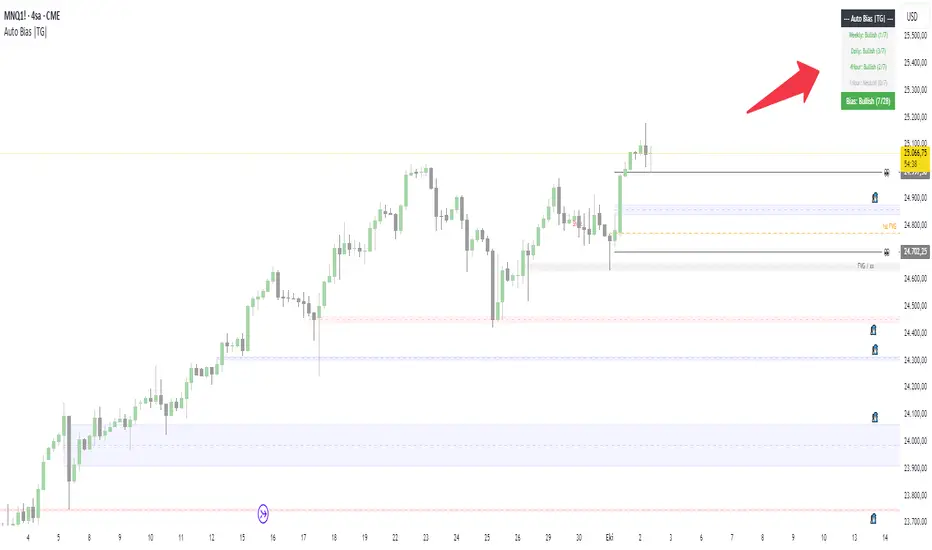 The Auto Market Bias Dashboard is a Pine Script v5 indicator developed on the TradingView platform. This tool automatically calculates and visualizes the market bias for the selected asset (crypto, forex, or futures). By analyzing the market structure across different timeframes (Weekly, Daily, 4-Hour, 1-Hour), it identifies bullish, bearish, or neutral trends. Its main purpose is to provide traders with a quick summary to simplify the decision-making process. The indicator is optimized particularly for 1-hour and higher timeframes and issues warnings on lower timeframes.