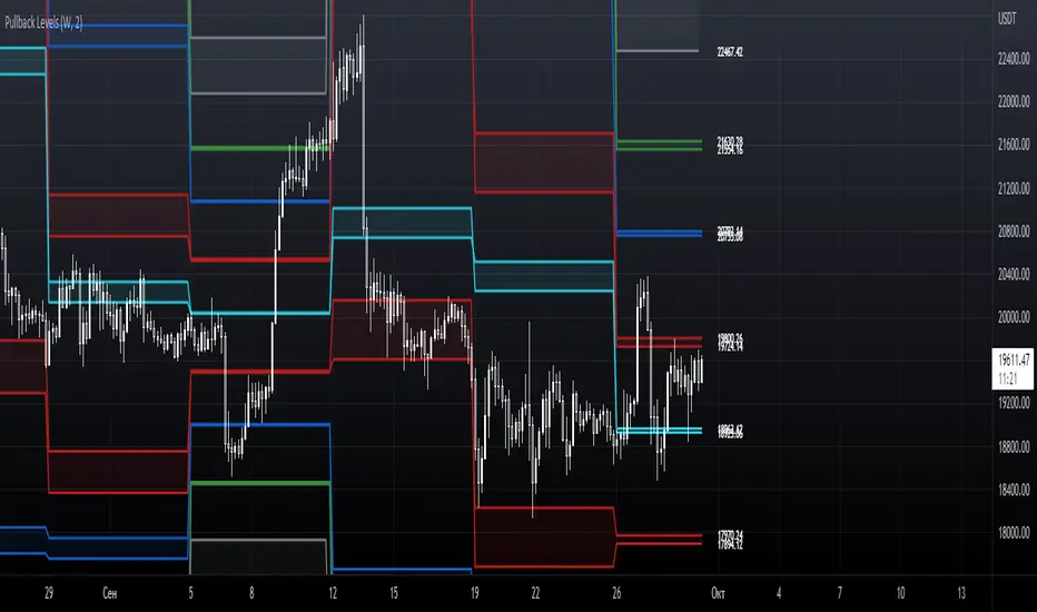 Pullback levels – технический индикатор для прогнозирования крупных ценовых движений путем расчета уровней поддержки и сопротивления. Используется для определения общего рыночного тренда на различных таймфреймах. Pullback levels используются при построение цены выше или ниже них, указывая на приоритетное направление движения.