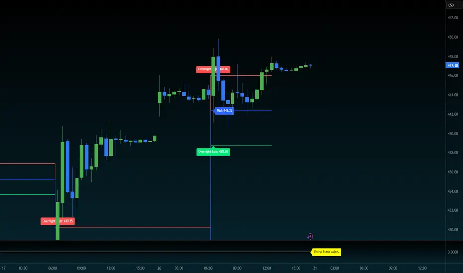 Overnight range: high and low with midline. Use it on ES, NQ, and Equity. Use for range or breakout.