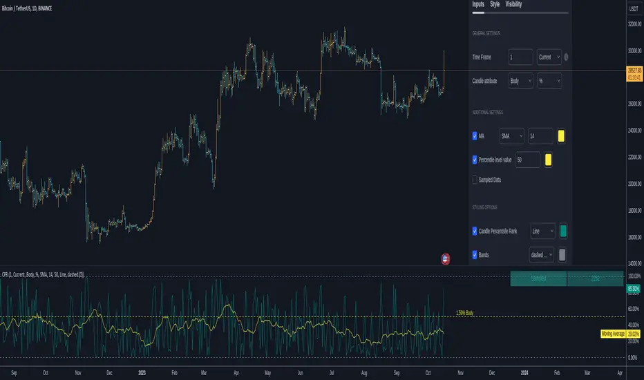 This script is designed to sample all available candles within a chosen time frame and provide a candlestick percentile rank to each candle. This script works by measuring a candle's body or its low to high value to the upside, or to the downside in percentage or in dollar value. Once the candle is measured its given a value based on all the previous measurements. You will be able to know if a body ( or a full candle/bar ) is above, or below a certain percentile level. By doing this you're effectively going to know if a candle is under performing or under-performing compared to the chart's history.