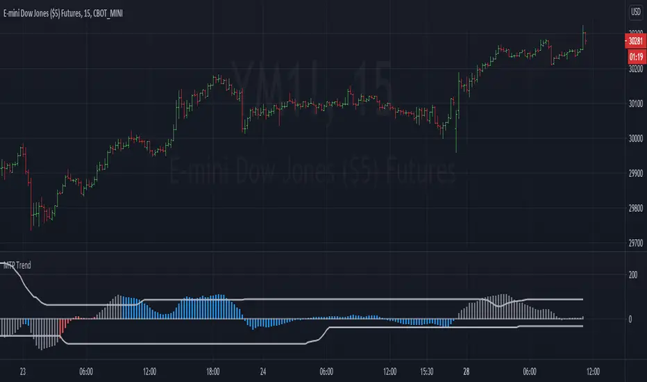 The MTP Trend script gives an easy to understand guide to the direction of the larger degree trend. Blue for up, Grey for neutral and Red for down. The colours are plotted on a 5/34 oscillator. The script is calculated using the position of the market relative to the MTP DP levels using the Major swings on the current Chart. It is the colour of the indicator that is important, not its level above or below the 0 line. It is designed to be used in conjunction with the MTP Decision Point (DP's) on the higher time frame chart. For more information on the MTP DP levels, please visit the publication of the MTP DP script.