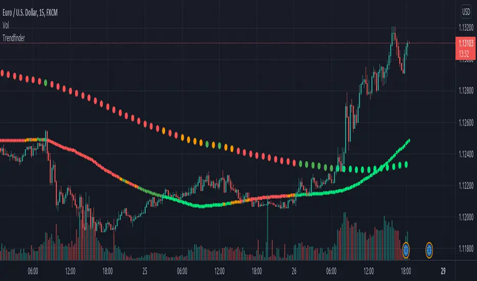 The Trendfinder displays 2 dotted Lines. The Bigger dots is a long Term Trend Analysis which will be referred to as Longterm-Line from now on. The Smaller dots is the short term Trend which will be referred to as Shortterm-Line from now on.