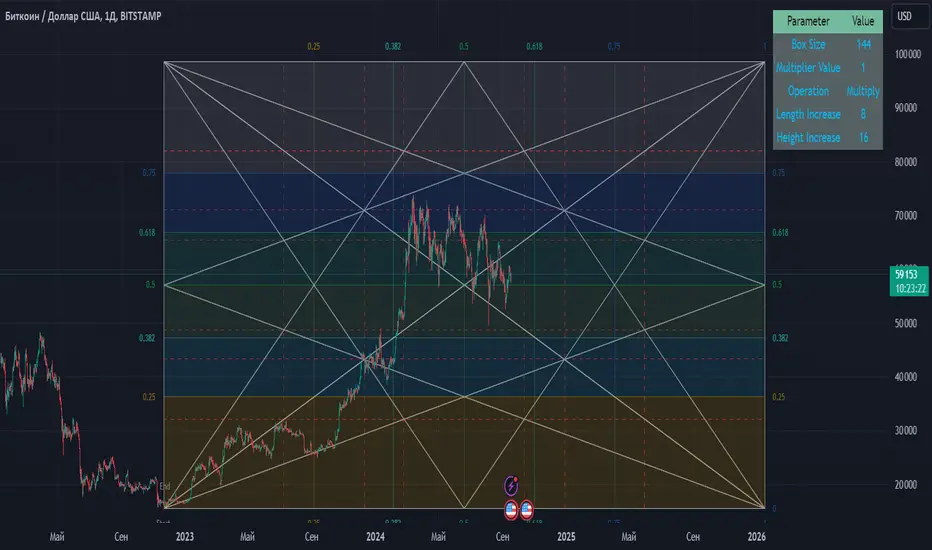 It's simple; the box can have derivatives of length and height. In the indicator, you can choose how many times you want to increase the height or length separately. Moreover, following Gann's methods and rules for constructing the box, there are no mistakes; this is the correct construction. In the indicator, the setting responsible for increasing the height is ⚙️ Height Increase, while the setting for increasing the length is ⚙️ Length Increase. However, everything is done according to the rules, and the increase in length and height occurs in fixed numbers: 1, 2, 4, 8, 16, 32.