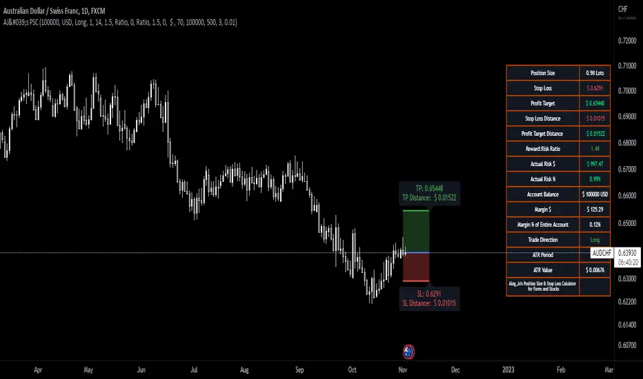 This position size/ stop loss and take profit calculator is designed to make entering positions more efficient. In the settings enter your account size and currency. Stop loss and profit levels can be calculated from the ATR or manually. To manually choose stop and profit price, choose manual from the SL or TP Value Type, then enter your price in the boxes below. Lot size or shares will be calculated and displayed on the table to the right of the chart. Position size calculation takes into account any currency exchange rates between your account currency and the quoted currency of the selected ticker. For forex lot sizes the exchange rate for the quoted currency relative to account currency is also built in to get an accurate position size. Enter your brokers leverage and your used margin will be displayed as well. The position size calculator is currently only configured for stocks and forex, I will try to add updates, in the future to other tickers like crypto , precious metals and crude oil CFD's. profit target and stop loss calculator should work for all symbols. I can't guarantee that the output of this calculator is correct. Use at your own risk!